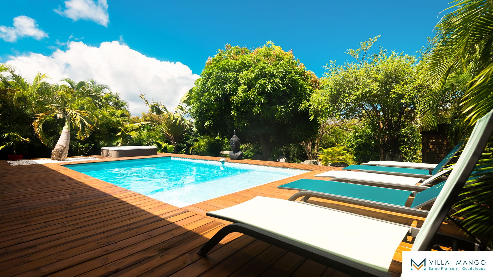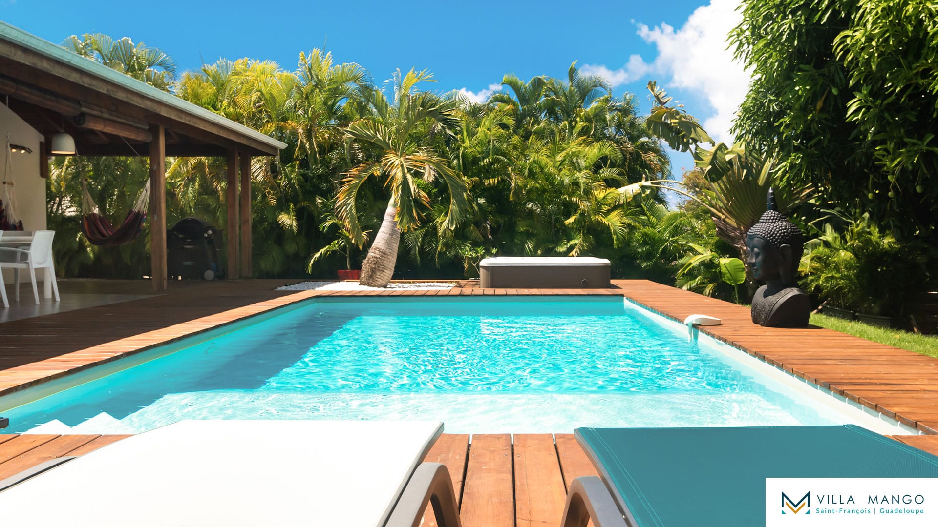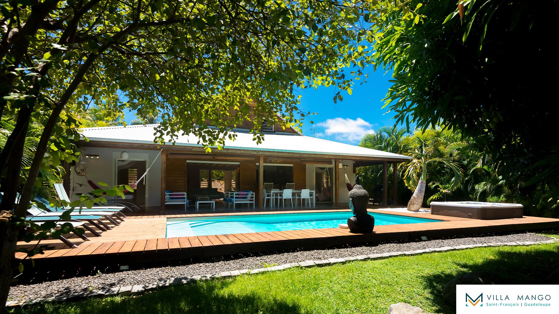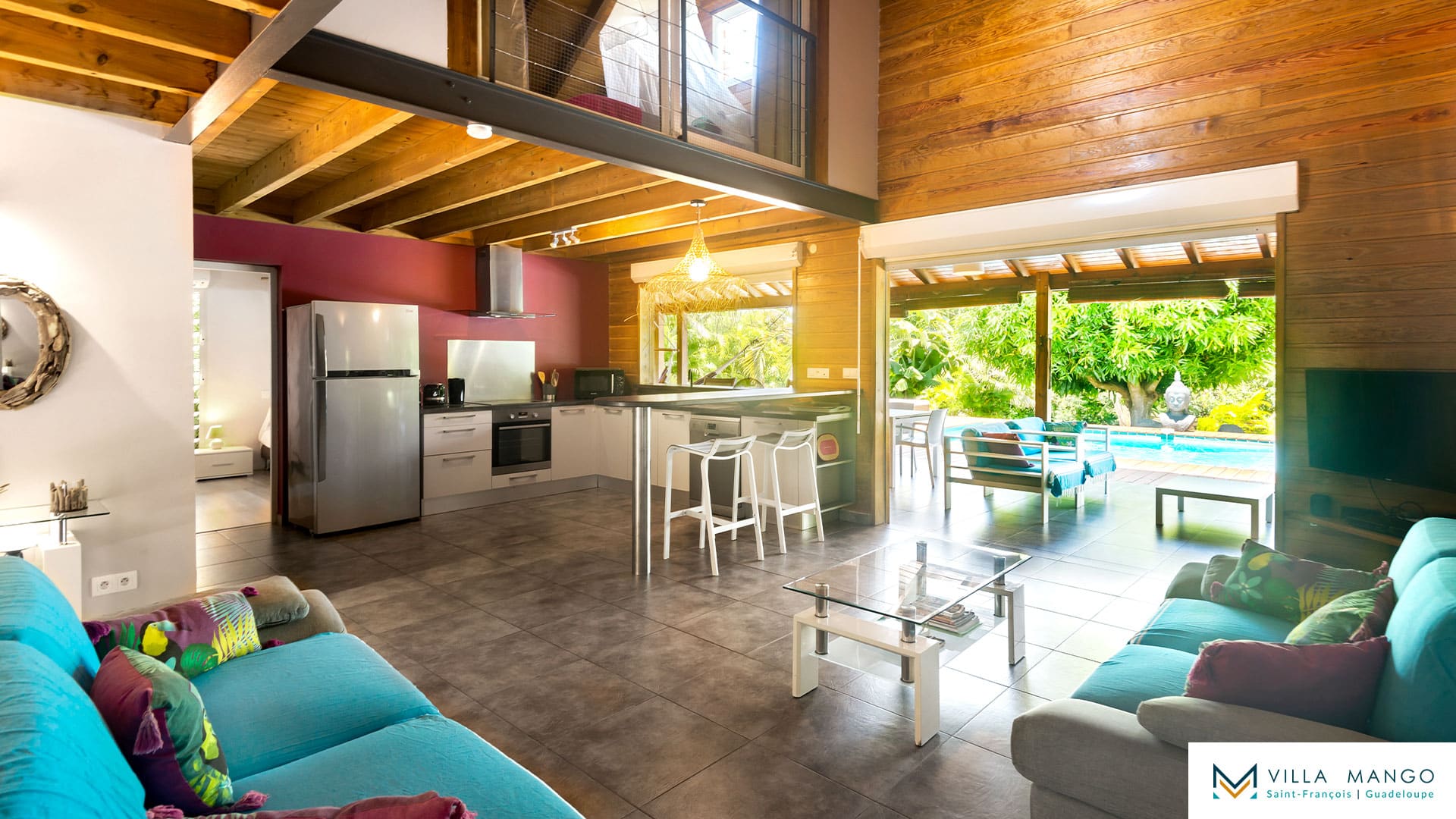 Le salon pleine hauteur ouvre sur une grande terrasse bois semi couverte donnant accès à une magnifique piscine privée et son jacuzzi. Vous profiterez ainsi du jardin tropical sans vis-à-vis, vous procurant un maximum d’intimité.