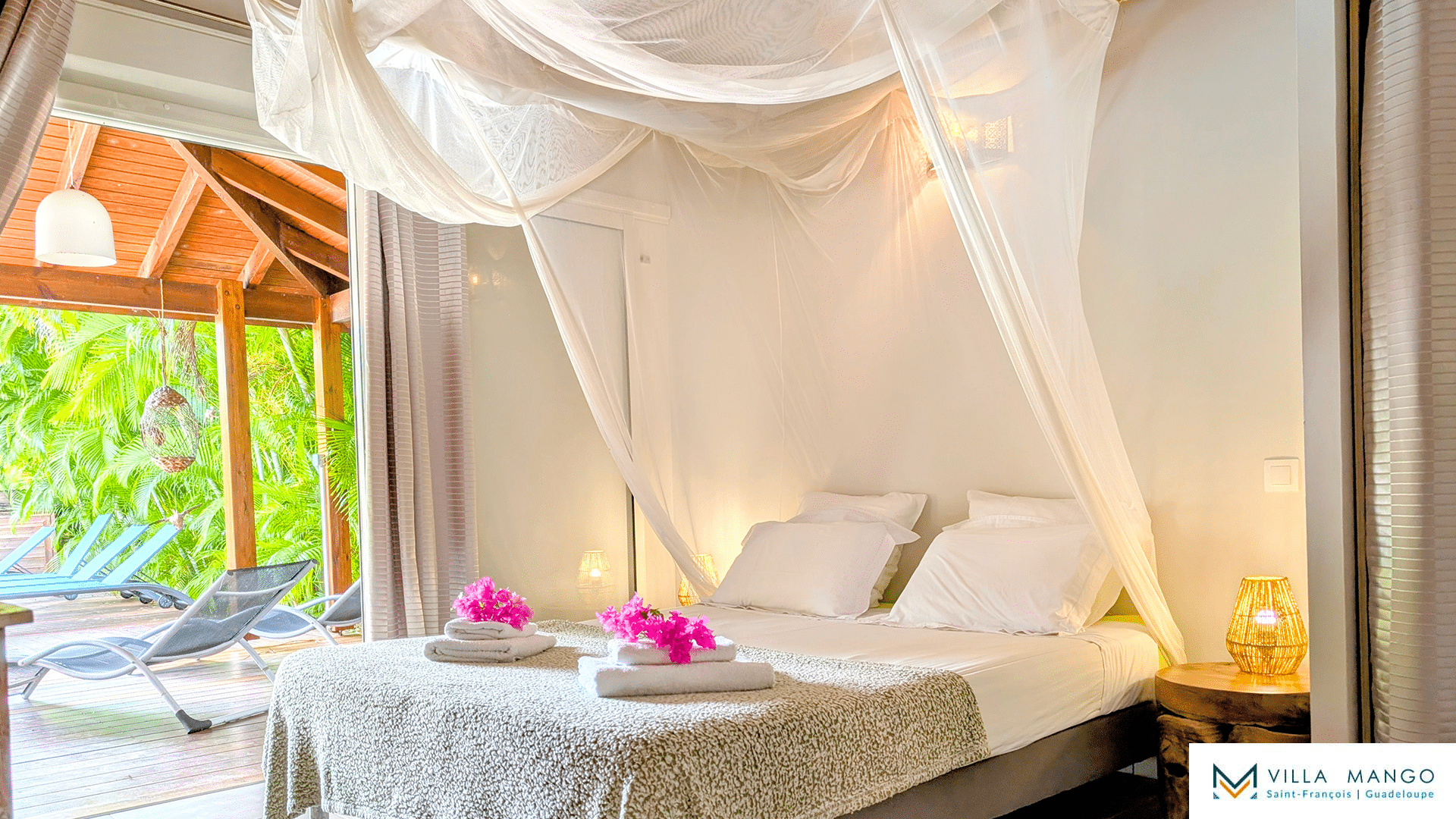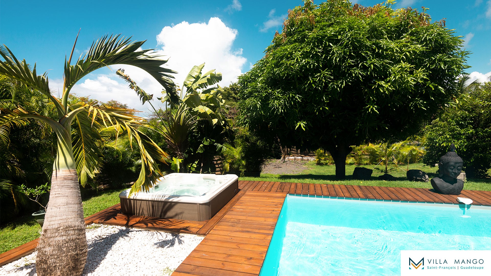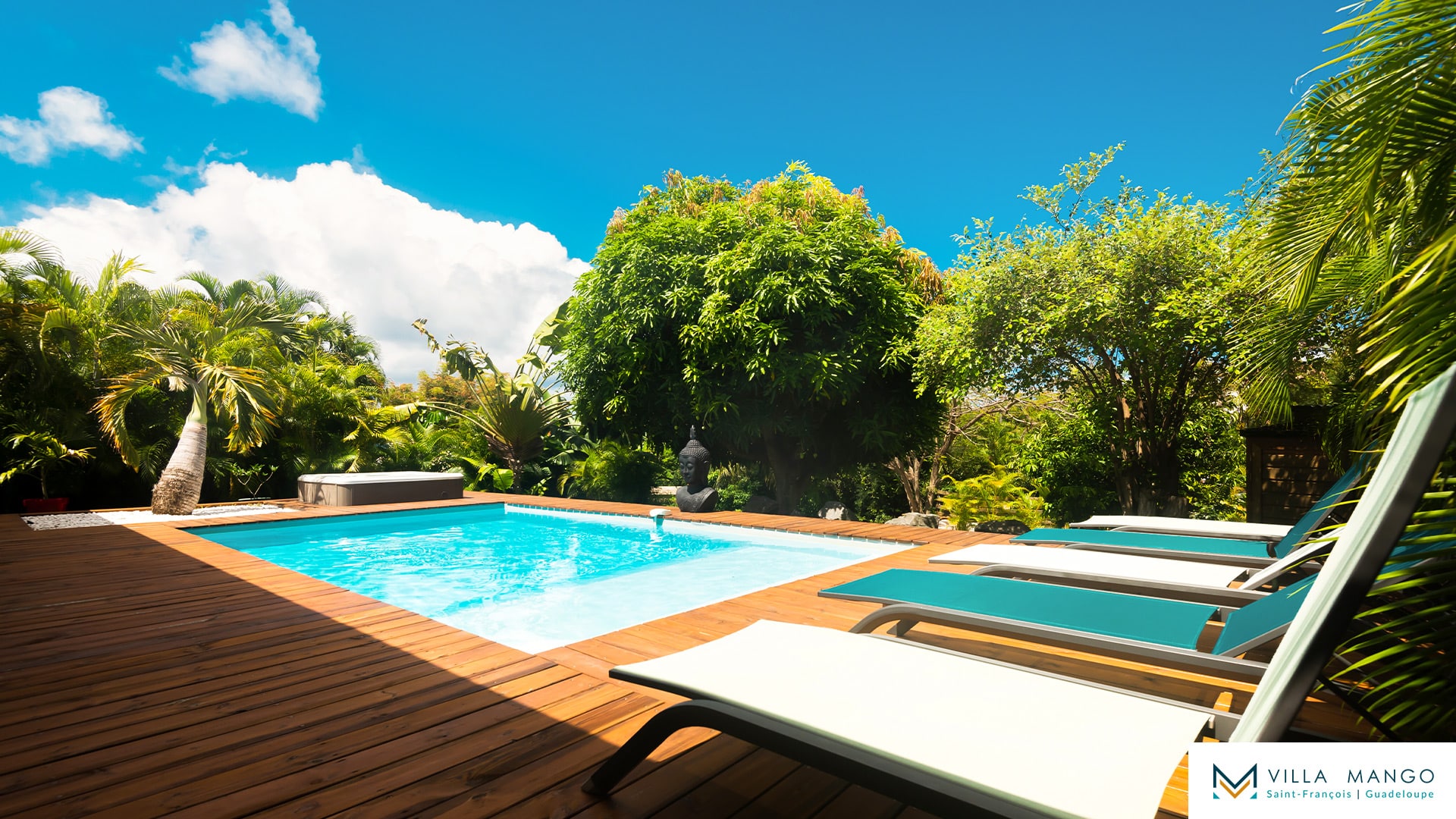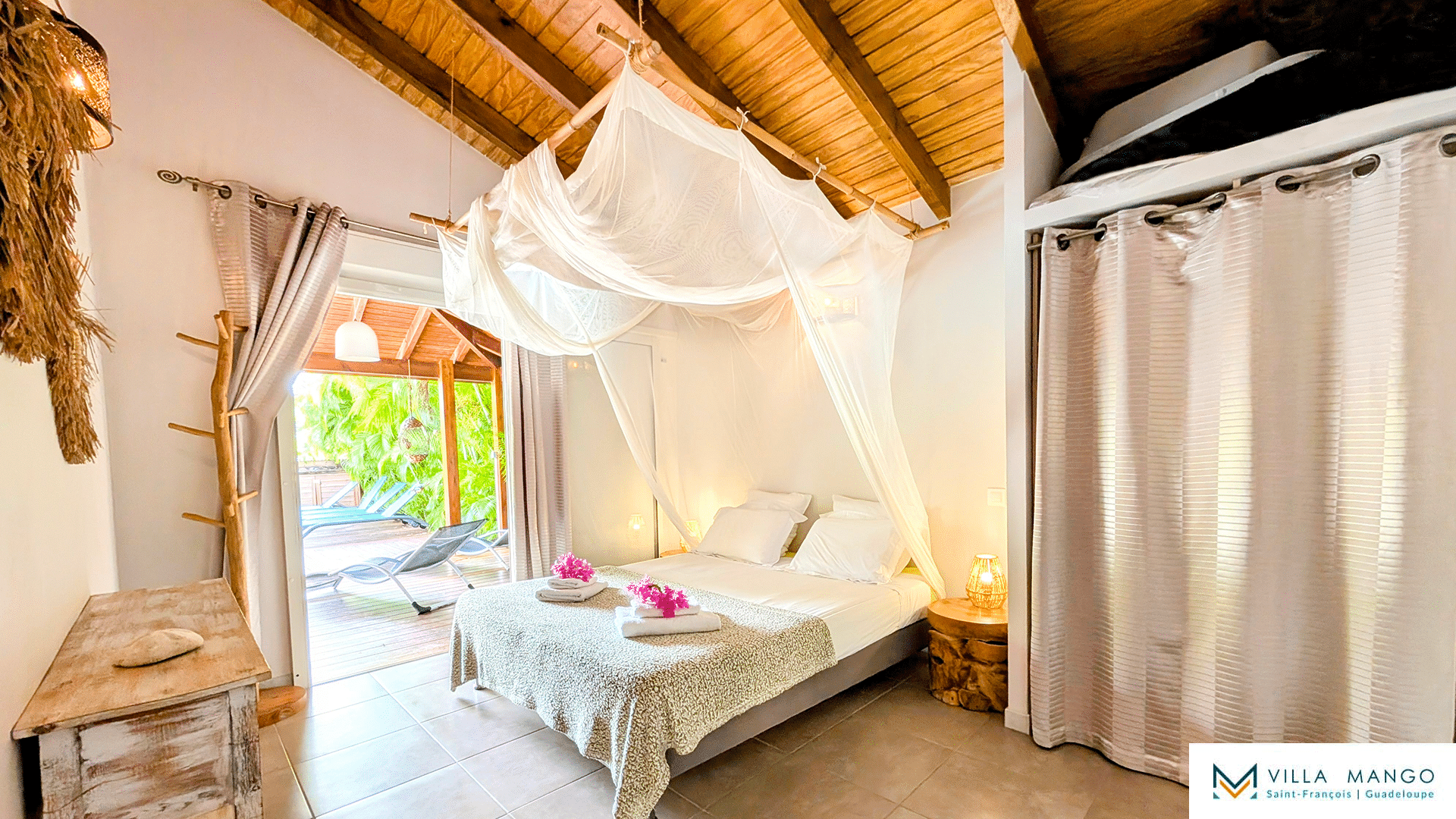 Le salon pleine hauteur ouvre sur une grande terrasse bois semi couverte donnant accès à une magnifique piscine privée et son jacuzzi. Vous profiterez ainsi du jardin tropical sans vis-à-vis, vous procurant un maximum d’intimité.
